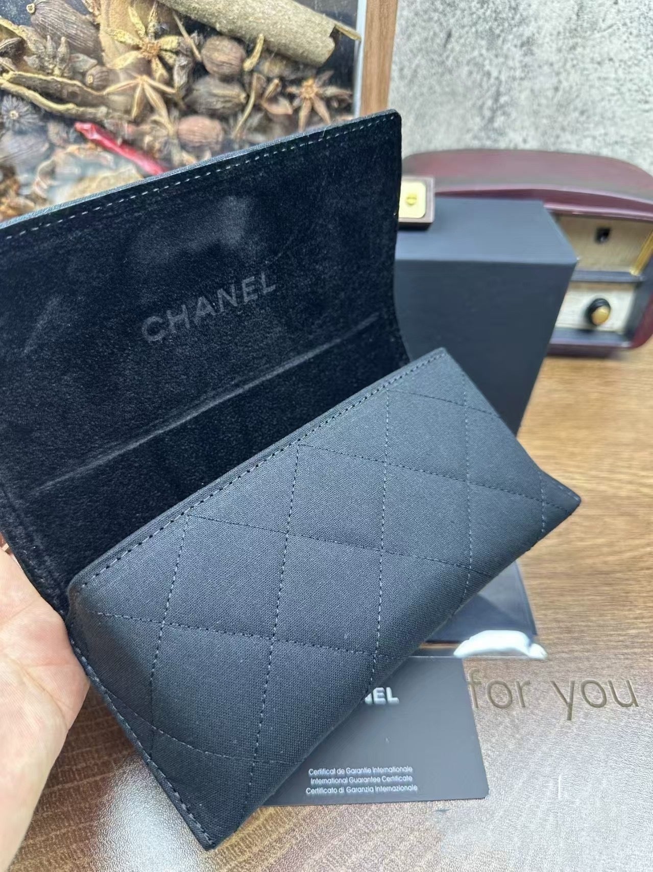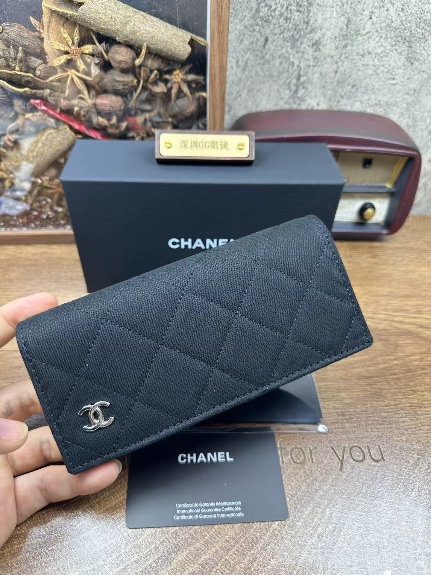 Klassiskt glasögonfodral i diamantgittermönster med metallaccenter
